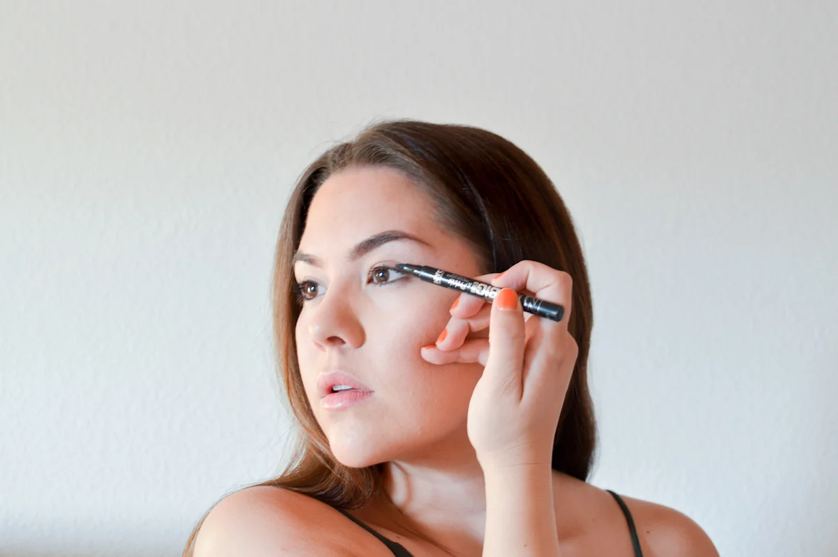 5. Since I'll be working with long lashes I'm going to be keeping the eyes neutral with a strong cat eye.Using a black liquid eyeliner line eye and add a wing from the corner, to add more drama line lower lid.