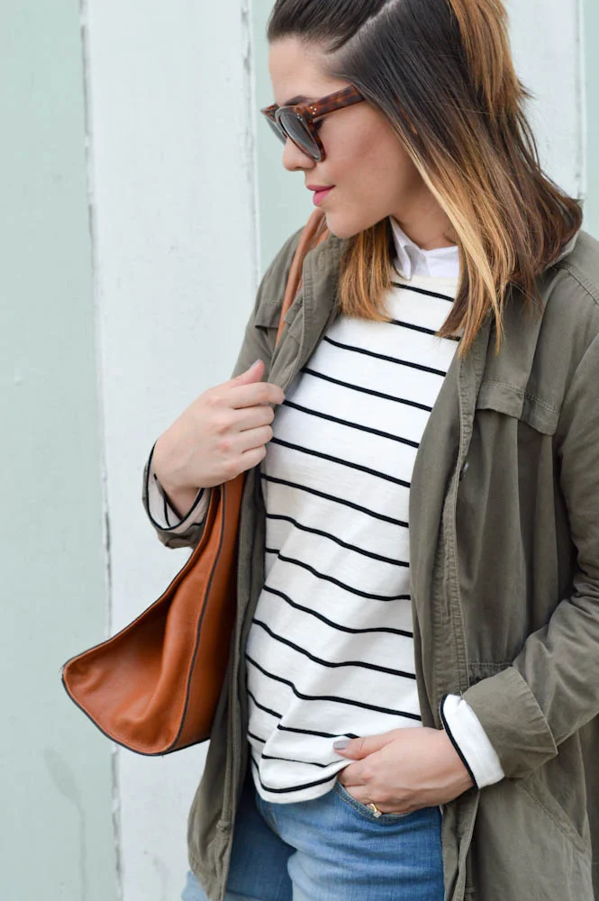 During the spring I like to mix things up by pairing a cuffed-denim style (like this pair) with a long sleeve and anorak. Both are light enough to wear with one another and can be easily wrapped around the waist or placed in the shoulders should the weather warm up. Another thing I love to do is style a collared sleeveless blouse with another shirt or sweater. It polishes the look for a classic edge without bulking sleeves up with another sleeve. If you're looking for a button-down style that works well under shirts opt for a style that cuts off at the shoulder.