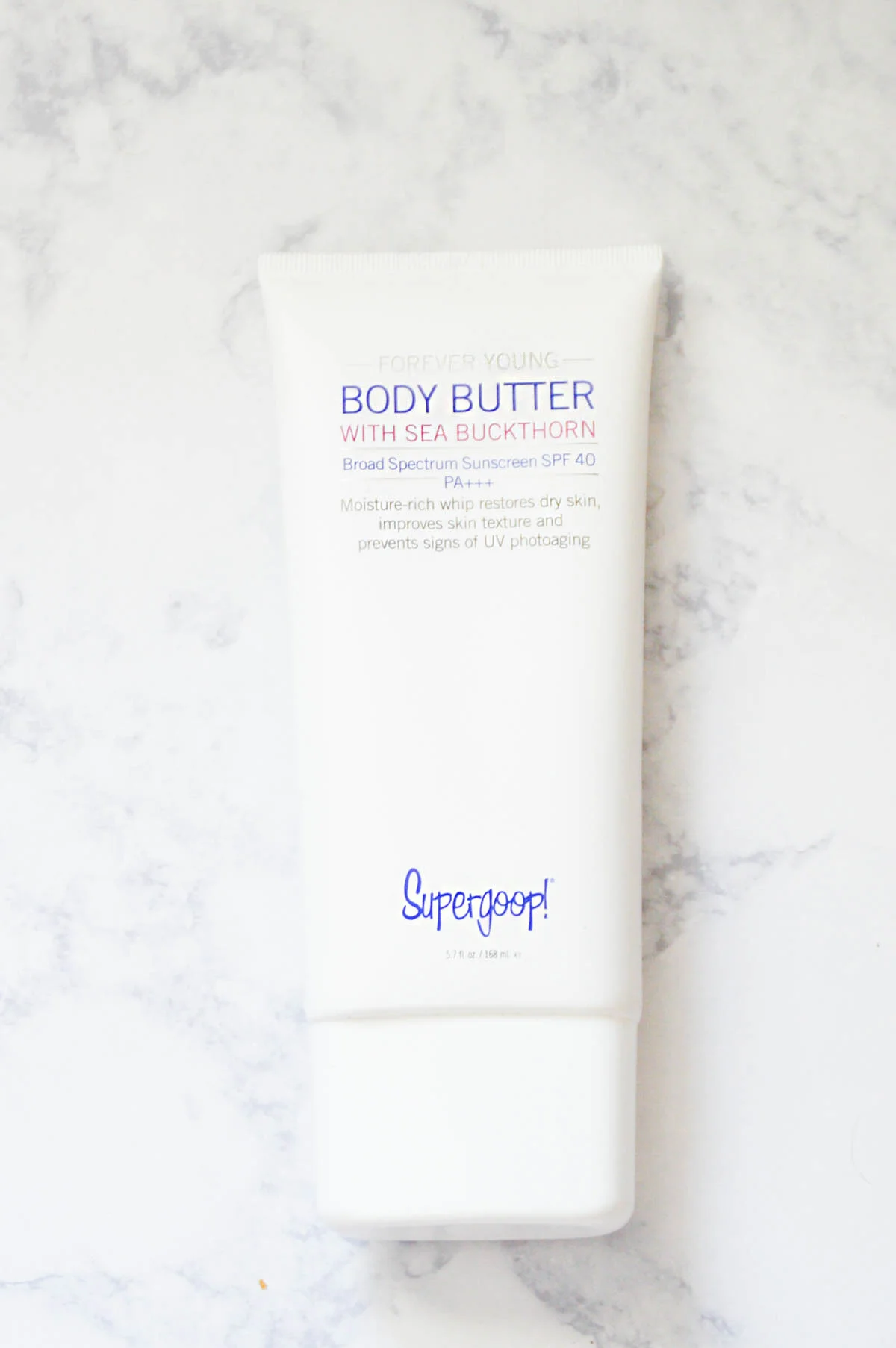 Keep this product in your beach bag! I've been a big fan of super goop sunscreen since last summer, and have been continuously amazed by their new products. This body butter delivers sun protection and keeps skins moisturized and luminous. I actually like to use this product if I know I'll be spending a large amount of time outdoors. The formula is buttery and leaves skin feeling like it just had a good drink of water. While it does leave skin with a soft dewy look, it doesn't become sticky when going into the sun, which is a huge bonus!