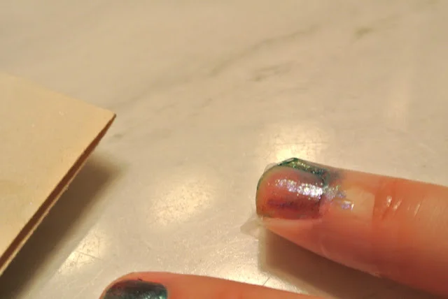 Once the sponge is set, apply the lacquer in which ever pattern you chose. I decided to go from green to dark purple or as pictured in the image above. Once the sponge is ready with your lacquer, apply straight to your nails. I did 2-3 coats on each nail to achieve the pictured results. This does not need to be perfect, so apply as little or as much as you like!