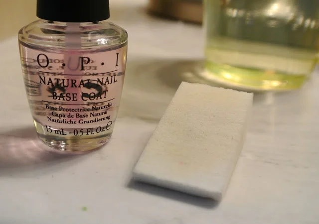 Start by trimming nails and applying a layer of base coat. I decided to tape off my nails so I could minimize the excess lacquer on my skin. Start by soaking a sponge in a cup of water, make sure the sponge absorbs enough water so the polish will not soak right through.