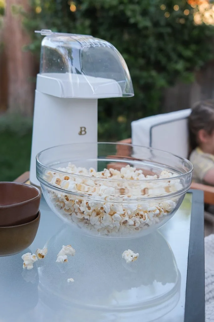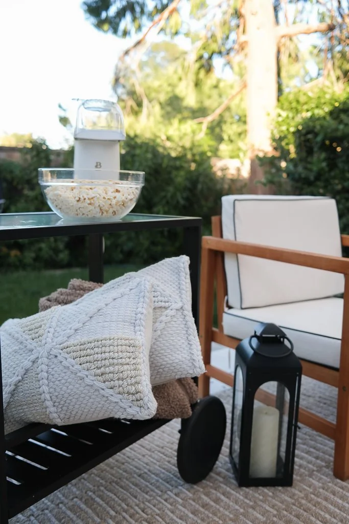 No movie night is complete without snacks and beverages. Set up a snack table with popcorn, chips, and other movie snacks. Walmart has a wide selection of affordable snack options. Or, if you have one set out a self-serve popcorn maker like this one from Beautiful by Drew Barrymore. Don't forget to provide some beverages like soda, lemonade, or water to keep your family and friends hydrated.