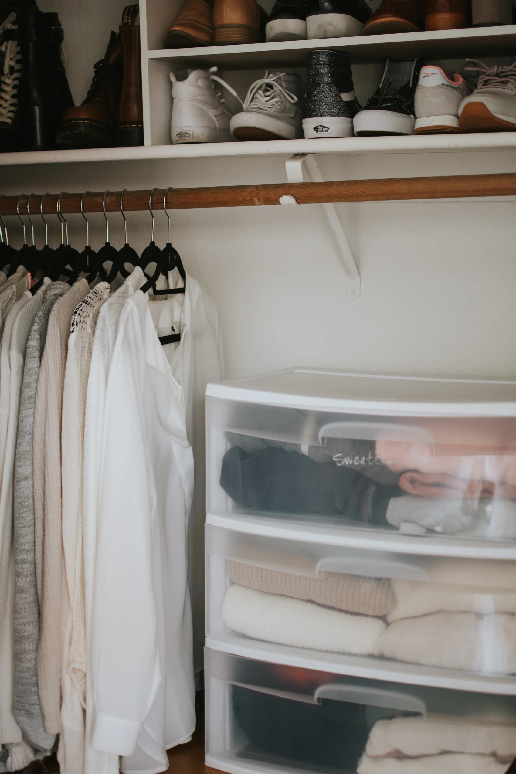 I’m one of those people who believe in only keeping out what I’m currently wearing. Living in California, there is no need for fur jackets in the middle of spring, nor is there a reason to keep sundresses out in winter. Keeping these packed in with things “of the season” adds to the clutter and makes it harder to sift through what you can wear. For this reason, I store off-season clothing in plastic storage containers until the time comes to wear them again. As a critical part of this organization, I only clean out what is currently in season.